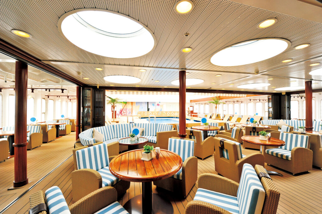 - 船内5階中央部にあり、海を眺めながら飲み物片手に過ごす書斎、といった落ち着きある雰囲気のこの空間。